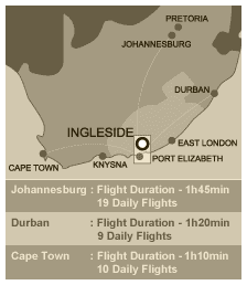 Ingleside is located 38km from Port Elizabeth Airport with daily domestic flights to Johannesburg, Durban and Capetown, and 15 minutes from the Coega Deep Sea Port.